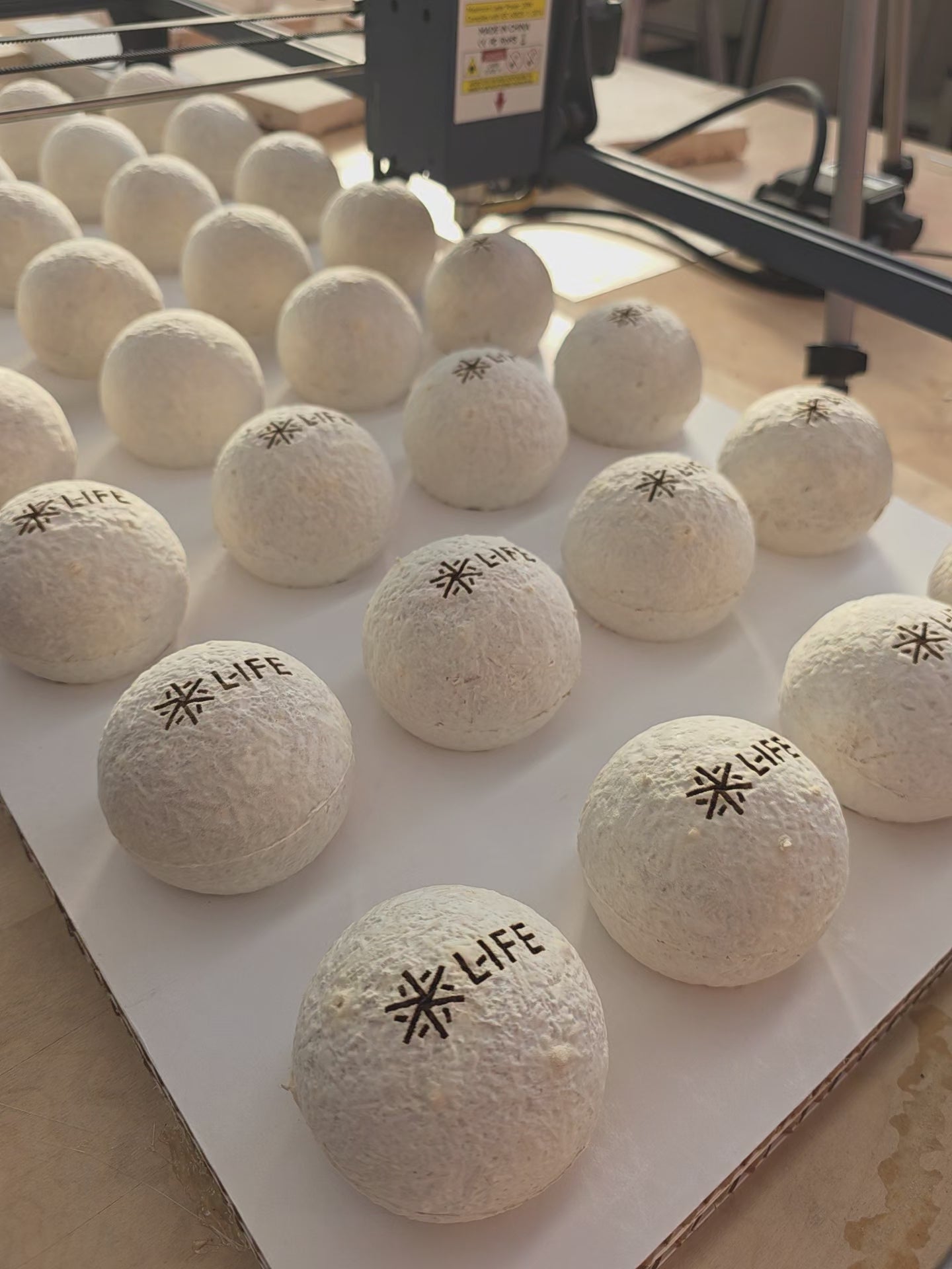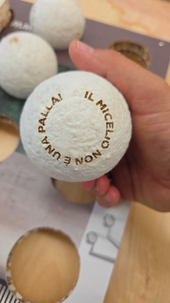 La texture del profumatore in micelio è unica: morbida e soft touch. Le palline possono essere personalizzabili tramite incisione a fuoco Chemical Free con il logo aziendale, per la diffusione di messaggi personalizzati e/o grafiche di qualsiasi tipo.